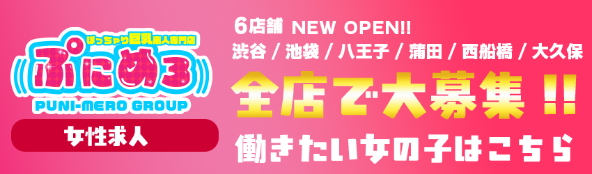 渋谷・池袋・蒲田・八王子・西船橋・大久保/新大久保 ぷにめろGROUP 風俗界に新たな旋風を巻き起こす激安ぽっちゃりデリヘル ぷにめろ。ぽっちゃり巨乳を愛する漢の夢にマッチしたぽっちゃり性感デリバリーヘルスです。ぽっちゃりが、巨乳が好きだ!!!という熱い想いを受け止める新しいぽっちゃりデリヘル。フェチズムを刺激し、想像を超える濃厚なサービスを全ての人に。誰もふわっふわの柔らかい巨乳の魅力には抗えません。マシュマロのようなおっぱいを格安料金で。 Group Ranking つきの(24) 西船橋 T:167 B:97 (F) W:73 H:98 プロフィール詳細 まあや(21)渋谷T:151 B:99 (F) W:65 H:94プロフィール詳細 みな(25)西船橋T:161 B:112 (H) W:73 H:107プロフィール詳細 あやな(22)蒲田T:165 B:98 (G) W:57 H:95プロフィール詳細 ありあ(22)池袋T:137 B:89 W:69 H:88プロフィール詳細 みらい(25)八王子T:146 B:108 (H) W:62 H:94プロフィール詳細 つきの(24) 西船橋 T:167 B:97 (F) W:73 H:98 プロフィール詳細 まあや(21) 渋谷 T:151 B:99 (F) W:65 H:94 プロフィール詳細 みな(25) 西船橋 T:161 B:112 (H) W:73 H:107 プロフィール詳細 あやな(22) 蒲田 T:165 B:98 (G) W:57 H:95 プロフィール詳細 ありあ(22) 池袋 T:137 B:89 W:69 H:88 プロフィール詳細 みらい(25) 八王子 T:146 B:108 (H) W:62 H:94 プロフィール詳細 Shop Information ぷにめろ渋谷店 ぷにめろ渋谷 おすすめ3人! えれな(21) T:155 B:115 (I) W:76 H:109 まあや(21) T:151 B:99 (F) W:65 H:94 ひとみ(24) T:159 B:96 (F) W:66 H:97 OPEN 12:00~CLOSE 3:00予約 TEL : 03-6416-1616https://punimero-shibuya.com/ 渋谷店の詳細はこちら ぷにめろ池袋店 ぷにめろ池袋 おすすめ3人! ありあ(22) T:137 B:89 W:69 H:88 うゆ(20) T:141 B:87 (D) W:55 H:86 みこ(19) T:151 B:98 (H) W:65 H:93 OPEN 12:00~CLOSE 5:00予約 TEL : 03-6914-0503https://punimero-ikebukuro.com/ 池袋店の詳細はこちら ぷにめろ蒲田店 ぷにめろ蒲田 おすすめ3人! あやな(22) T:165 B:98 (G) W:57 H:95 ののか(21) T:154 B:92 (G) W:58 H:80 らん(18) T:146 B:93 (F) W:55 H:95 OPEN 12:00~CLOSE 3:00予約 TEL : 03-6715-9337https://punimero-kamata.com/ 蒲田店の詳細はこちら ぷにめろ八王子店 ぷにめろ八王子 おすすめ3人! みらい(25) T:146 B:108 (H) W:62 H:94 しの(22) T:157 B:94 (F) W:64 H:90 ゆい(26) T:155 B:101 (H) W:67 H:97 OPEN 12:00~CLOSE 1:00予約 TEL : 090-4295-0778https://punimero-hachioji.com/ 八王子店の詳細はこちら ぷにめろ西船橋店 ぷにめろ西船橋 おすすめ3人! みな(25) T:161 B:112 (H) W:73 H:107 つきの(24) T:167 B:97 (F) W:73 H:98 らん(19) T:152 B:88 (D) W:61 H:89 OPEN 12:00~CLOSE 24:00予約 TEL : 080-6519-8008https://punimero-nishifunabashi.com/ 西船橋店の詳細はこちら ぷにめろ大久保・新大久保店 ぷにめろ大久保・新大久保 おすすめ3人! みな(25) T:161 B:112 (H) W:73 H:107 つきの(24) T:167 B:97 (F) W:73 H:98 らん(19) T:152 B:88 (D) W:61 H:89 OPEN 12:00~CLOSE 5:00予約 TEL :070-5326-5722https://punimero-okubo.com/ 大久保・新大久保店の詳細はこちら